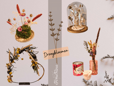 Droogbloemen zijn multifunctioneel en zijn bij FlowRina verwerkt in o.a. kransen, stillevens in een stolp of als andere unieke creatie. Ze zijn langer houdbaar als vers en zijn verkrijgbaar in de mooiste soorten en geverfde kleuren. Over het algemeen zijn droogbloemen tot een jaar houdbaar, wil je nou langer genieten kies dan voor Zijdebloemen.